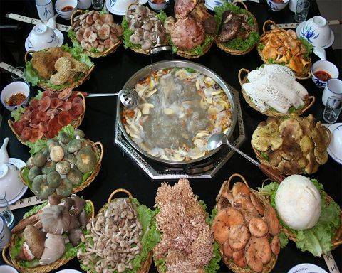 【晚餐菜譜參考】(特色餐廳、野生菌風(fēng)味餐350元/人)土雞野菌湯、野菌八道、(青桿菌、花菇、雙孢菇、茶薪菇、北方菌、黃落傘、包谷菌、木耳)、葷菜四道、(土雞、老肉卷、脊肉卷、火腿)、時(shí)蔬六道、(土豆、豆芽、蓮花白、小白菜、小苦菜、金白菜)、主食:薩尼大餅、米飯、面條、水果拼盤(pán)。