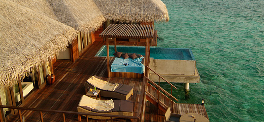水上屋建造于礁湖上,屋外的甲板可以直接從階梯躍入海洋,加上一個無限延伸視野的小泳池海天連線,讓您縱情于藍(lán)色愛情海。屋內(nèi)配置一個特大床,和一個寬敞的浴室,干濕分離的兩個淋浴設(shè)備。