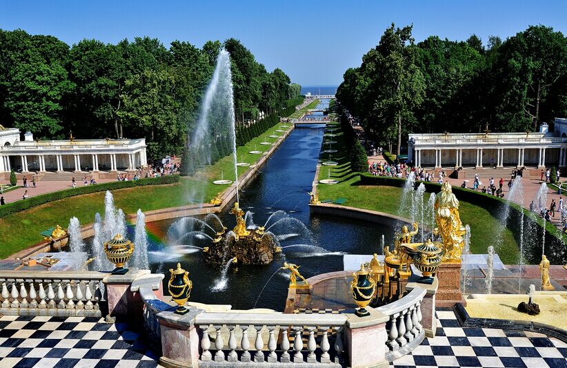 夏宮花園:俄羅斯夏宮又稱彼得宮,坐落在芬蘭灣南岸的森林中,它始建于1714年,分為上花園和下花園,大宮殿(宮殿外觀)在上花園。這里的建筑豪華壯麗,被譽(yù)為“俄羅斯的凡爾賽”。 大宮殿前是被稱作大瀑布的噴泉群。這里有37座金色雕像,29座潛浮雕,150個(gè)小雕像,64個(gè)噴泉及兩座梯形瀑布。在噴泉群一個(gè)大半圓形水池的中央,聳立著大力士參孫和獅子搏斗的雕像,這就是著名的隆姆松噴泉。