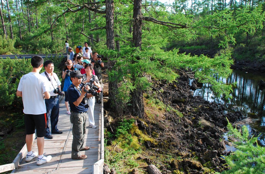 早餐后,參觀日偽時期建造的阿爾山火車站,乘車(約2小時)赴阿爾山國家森林公園(含門票),途中飲“天下第一奇特大泉”五里泉圣水,沿途綠色林海、銀色河流構(gòu)成一幅絕美畫卷。森林公園內(nèi)游覽素有夏日冰川美譽的哈拉哈河風景河段--三潭峽,低位火山口湖地池。觀賞亞洲第一火山熔巖地貌——石塘林,游覽火山堰塞湖--杜鵑湖,自由活動1小時(視時間情況安排)