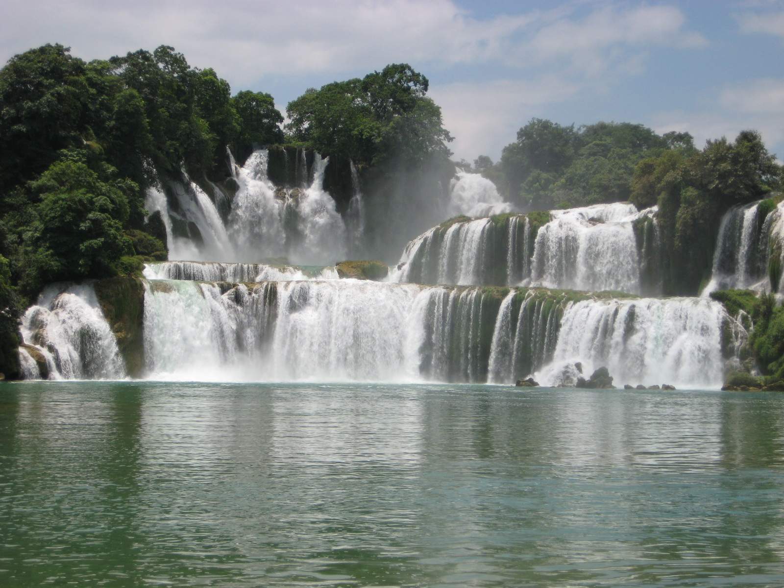 下午:中餐后;游覽德天跨國瀑布(徒步游覽約2H)??胺Q亞洲第一大的德天跨國瀑布,橫跨中越兩國,瀑布寬200多米,落差70多米,瀑布從高峻的石崖上、翠綠的石巖中傾泄而出,形成三層自然瀑布,遙望似素縞垂天, 近觀則白霧升騰、飛珠濺玉,氣勢磅礴,蔚為壯觀與緊臨的越南板約瀑布相連,同時還可觀賞到越南板約瀑布。