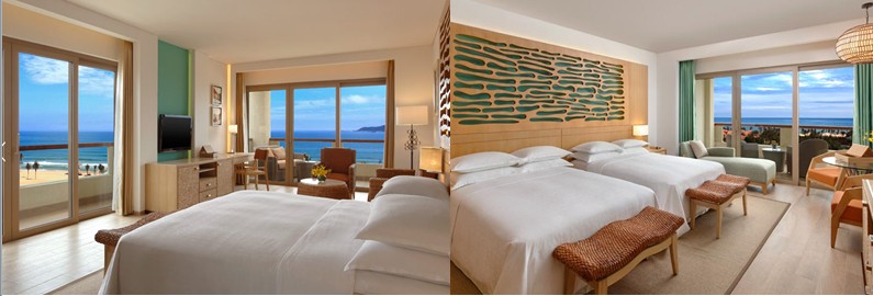 460間寬敞客房及40 間套房均秉承舒適至上的設(shè)計(jì)理念,面積從50至150平米不等,可欣賞到壯觀迷人的海洋美景和泳池風(fēng)光,獨(dú)具特色的喜來登甜夢(mèng)之床?鋪有豪華床墊和舒適羽絨被,此外臥室內(nèi)還設(shè)有一臺(tái)液晶純平電視和一張寬大的辦公桌,您可通過有線及無線高速上網(wǎng)接入與親友和同事保持緊密聯(lián)系,您可在舒適的花園景觀客房悠然地欣賞園林美景,或是走出泳池景觀客房或尊貴豪華海景客房的寬敞陽(yáng)臺(tái),飽覽壯觀景致。