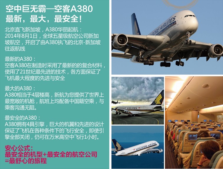 精心甄選  五星航空公司新加坡航空空中巨無霸—A380的全新體驗(yàn),**大,**新,**安全!
