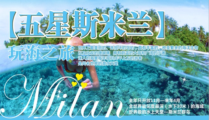 早餐后乘車前往碼頭,乘快艇前往【SIMILAN斯米蘭群島】,9個(gè)島中我們挑選了其中**美麗的4個(gè)島,去盡情的游泳與浮潛。同時(shí)可以在銀白色的沙灘上自由活動(dòng)。斯米蘭島的美麗是無法用言辭來形容的,只有您的親身體驗(yàn),才能感受它的獨(dú)特魅力。首先我們參觀其中**美麗的【4號安島(Koh Miang)】,這里大片堅(jiān)固的珊瑚礁高度逐漸地降低到大概30-40米,由于海水深度的增加,這個(gè)位置被沙子所代替了。在這些島嶼周圍形成的旋渦狀的、營養(yǎng)豐富的水域有著大量色彩艷麗的熱帶魚, 在這些水域觀賞到巨大魚兒的機(jī)會是很少的,但是在這你也許會偶然碰到美洲豹鯊魚,甚至鯨魚。這里有二十多處合格的潛水點(diǎn),有許多已發(fā)展起來擁有自己的國際聲譽(yù)。之后前往【 9號班古島(Koh Bangru)】上的【圣誕角(Chrismas Point)】,這里是以系列蜿蜒迷人的海灣而得名,多彩成群的藍(lán)鰭鲹,金槍魚穿梭其中,潛水愛好者您不妨體驗(yàn)暢游其中的樂趣。后乘快艇往【8號斯米蘭島(Koh Similan)】享用午餐,8號斯米蘭島上的象頭巖(Elephant Head)可能是這群島嶼中**著名的潛水地帶,這里是以伸出海面到斯米蘭島西南角的、形狀不規(guī)則的巖石而命名的。【仙境礁(Fantasy Reef)】, 是適合于勘探大量水下巖石形成的受歡迎的地點(diǎn),同時(shí)在這也能碰到一些活的發(fā)光物體。我們可以在這里進(jìn)行【浮潛】,一覽海底世界豐富的魚群,及五彩繽紛的珊瑚。