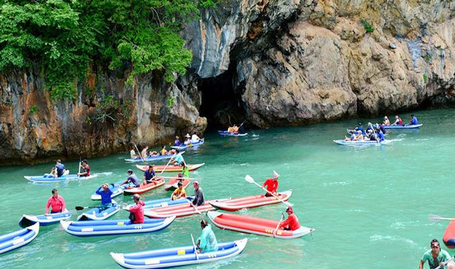 驅(qū)車前往攀牙府,日本電視臺NHK世界神跡傳說節(jié)目,所追蹤報(bào)導(dǎo)的攀牙灣府國家保護(hù)區(qū)【象牙寶穴】(游覽時間約120分鐘)探尋攀牙府象山神奇?zhèn)髡f的腳步,其外觀神似巨象的模樣襯的蔚藍(lán)的天空及清翠的山林背景,讓人仿若進(jìn)入探險(xiǎn)世界。此洞穴是公元2000年底新開發(fā)的景點(diǎn)為降底對洞內(nèi)珍貴自然景觀及鐘乳石的環(huán)境沖突,每天限定(200名游客)入內(nèi)。參觀者帶著頭燈搭乘兩人一組由工作人員劃行【橡皮船泛舟】進(jìn)入洞內(nèi),進(jìn)入洞內(nèi)請不要拍照,為保護(hù)洞內(nèi)原始生態(tài)(注:請付工作人員小費(fèi)50銖/人);沿著地下河緩緩進(jìn)入眼簾的奇特景觀將讓您有意想不到的驚喜。之后換乘【竹筏】前往傳說中可走晦氣帶來好運(yùn)的【幸運(yùn)池】。隨后帶您來一趟大自然之旅:  乘坐聰明絕頂?shù)拇笙蟀仙缴嫠朴卧趨擦种?,讓您深刻感受大自然的洗禮。