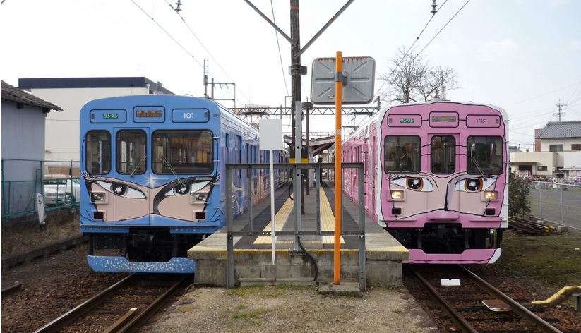 【忍者列車】伊賀市以「忍者的故鄉(xiāng)」聞名于世。在城市中心有只有在伊賀才可以看到的整個(gè)車體繪有忍者造型的電車。 這個(gè)電車在當(dāng)?shù)乇淮蠹矣H切地稱為:忍者列車、KUN?(女忍者)列車,并且有很多鐵路迷到訪此地。忍者列車由綠色、粉色、藍(lán)色三種顏色構(gòu)成,不管是哪一種,車前方和側(cè)方都繪有松元零士設(shè)計(jì)的,閃閃發(fā)光細(xì)長(zhǎng)眼的KUN?的特寫,猶如疾馳的KUN?。