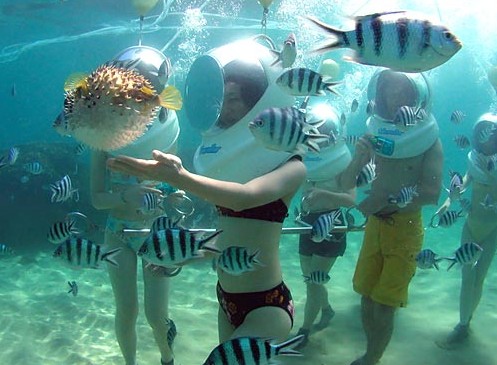 接下來(lái)我們達(dá)成快艇到海中央來(lái)個(gè)【太空罩海底漫步】:大家不需要任何的技巧或勇氣,這項(xiàng)專(zhuān)門(mén)設(shè)計(jì)給旱鴨子用來(lái)感受神奇海底世界的裝置,如同航天員戴的圓形透明頭盔,讓您能在水深不及6公尺處的海底漫步,而頸部以上皆是空氣,眼鏡與頭發(fā)等皆不會(huì)潮濕。海底色彩斑斕的魚(yú)兒從身邊而過(guò)。當(dāng)您取出特制魚(yú)食,在面前喂食,瞬間功夫,周?chē)奂松习贄l魚(yú)。在水中有使用深潛裝備的工作人員隨侍在旁,安全無(wú)慮,除了七彩繽紛的熱帶魚(yú)與活珊瑚可欣賞,還有機(jī)會(huì)觸摸到海星與海參,是非常有趣難得的體驗(yàn)。