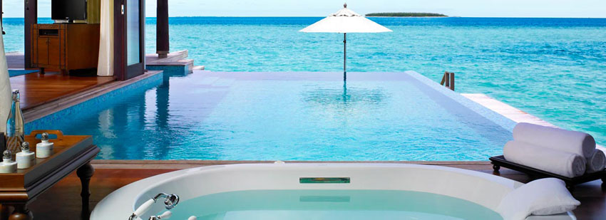 2晚沙灘泳池別墅Beach Pool Villa+2晚水上泳池別墅Over Water Pool Villa ¥16950 含早餐、水飛