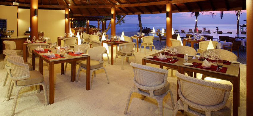 傳統(tǒng)的馬爾代夫圓柱型建筑,茅草裝飾的頂棚,讓你仿佛在馬爾代夫酋長(zhǎng)家里用餐。