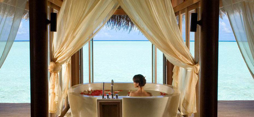 132平方米的日出水上套房建于水晶般清澈的海面之上,伴著醉人美景開啟精彩的每一天。在您的私人日光甲板上欣賞溫暖的馬爾代夫旭日在海平面上冉冉升起,或是打開套房的木框門,慵懶的躺在床上欣賞這一美景。 無需潛入水中,透過浴室地板的玻璃觀景窗即可欣賞多姿多彩的海洋生物。 套房色調靈感源自光怪陸離的海底世界,隱隱閃現艷麗的熱帶魚和珊瑚色彩。 在舒適的特大雙人床上酣睡,在配有靚麗長毛絨靠墊的豪華日光躺椅上休憩。 在浴缸內放松身心,透過木框玻璃拉門欣賞迷人的瀉湖美景,或是縱身躍入豪華私人靜居之下的碧藍海水之中。