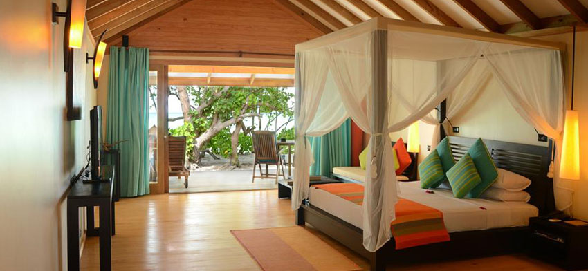 能觸摸到的奢華,帶按摩浴缸的海灘別墅為客人提供更寬敞的臥室面積、四海報的床上,私人庭院的木質(zhì)甲板上有按摩浴缸