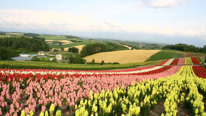 【富田農(nóng)場】(約40分鐘)富田農(nóng)場為北海道*先驅(qū)的花田之一。原僅栽種熏衣草的富田農(nóng)場在主人的精心打理下漸漸地成為今日所見的彩虹花海。熏衣草以外,來到這里您還可以看到法國金盞花,罌粟花,羽扁豆花等多種花朵競艷,景觀讓人難忘。