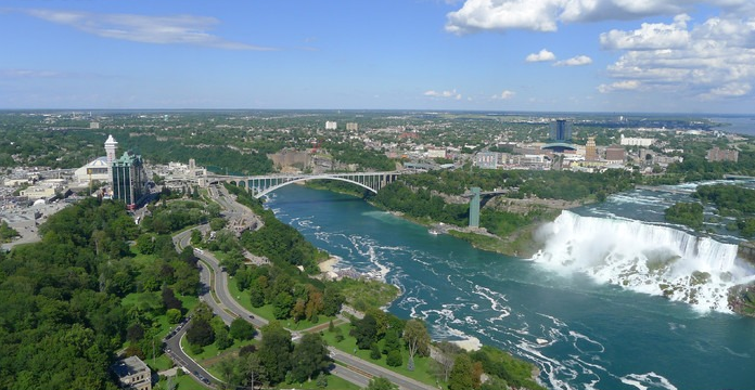 乘車前往布法羅(Buffalo)美國紐約州西部伊利湖東岸的港口城市,位于尼亞加拉河南口,西與加拿大伊利堡隔尼亞加拉河相望。旅美僑胞們常把這座城市叫做水牛城,因?yàn)椴挤_本是水牛的意思。不過此地從未見過水牛,古時(shí)倒是有野牛出沒,也是印第安人狩獵的地方。世界七大自然奇景之一的[尼亞加拉瀑布]游覽。尼亞加拉大瀑布被美國境內(nèi)的山羊島,分隔成兩部份,其中【美國瀑布】大約 328公尺寬,另有一支流,稱為【新娘面紗瀑布】終日發(fā)出萬馬不絕于耳的水聲,令人嘆為觀止。