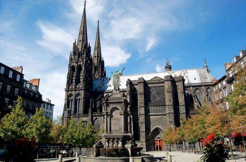 上午:乘車前往克萊蒙費朗,城內(nèi)的圣母教堂是世界上唯一一座用火山熔巖建成的大教堂,遠(yuǎn)看就像是被煙熏黑了一樣;港口圣母教堂是奧弗涅羅馬式的代表建筑,被列入世界文化遺產(chǎn),老城漫步