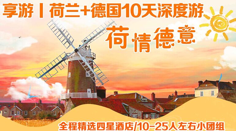 搭乘芬蘭航空國(guó)際航班,入住精選四星級(jí)酒店,10-25人左右小團(tuán)組,贈(zèng)送WIFI、荷蘭特色鯡魚(yú)餐、德國(guó)豬肘餐