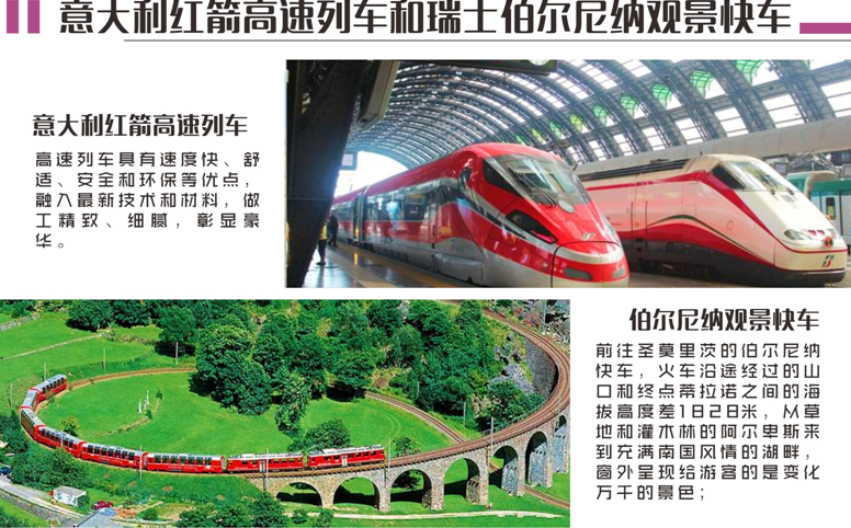 產(chǎn)品亮點(diǎn)  景觀(guān)列車(chē)--世界文化遺產(chǎn)伯爾尼納快車(chē);高速鐵路--意大利紅箭高速列車(chē);梵蒂岡圣彼得大教堂“綠色通道”+講解