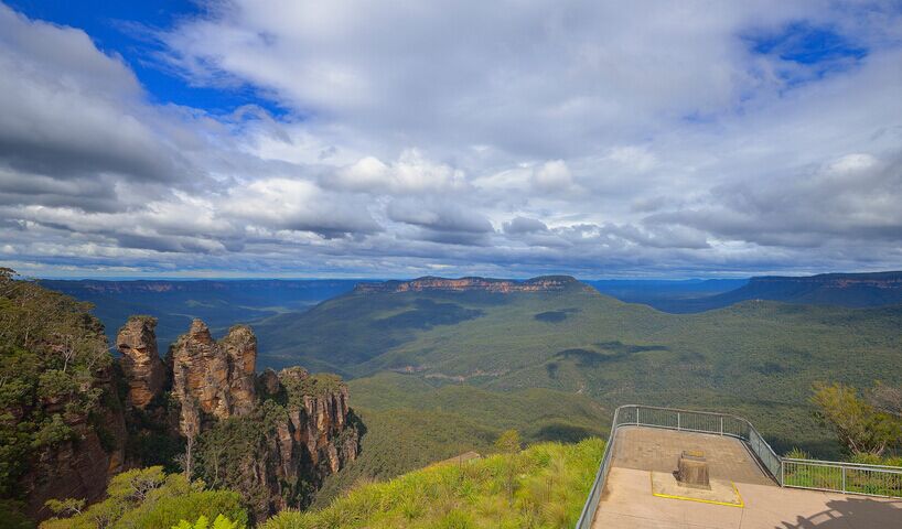 【埃科角與三姊妹峰】觀賞藍(lán)山標(biāo)志性景觀三姐妹峰的*佳位置??平牵从诎闹尥林裨挼娜⒚梅迨?個依在一起的黃褐色的崖頭,造型也頗生動(停留約10分鐘)