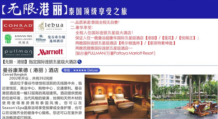 甄選泰航直飛曼谷,全程無自費(fèi),入住1晚超奢華曼谷【港麗/悅榕莊/蓮花】+2晚芭堤雅國(guó)際5星【鉑爾曼PULLMAN/萬豪】+3晚曼谷國(guó)際5星【希爾頓逸林/索菲特素坤逸】,搭乘五星泰航或國(guó)航直飛曼谷