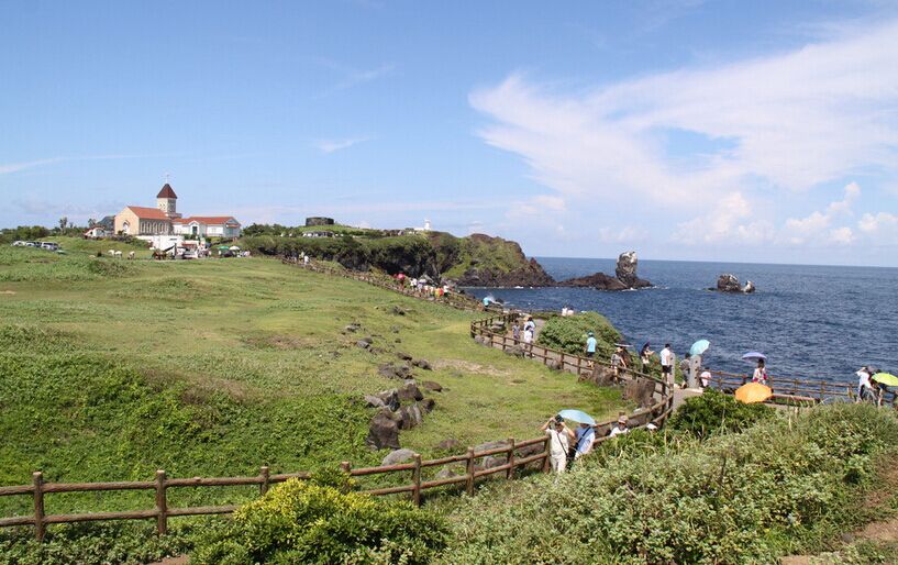 【涉地可支】(停留時(shí)間約30分鐘)涉地可支位于韓國濟(jì)州島東部海岸的一端。“涉地”是這一地區(qū)古代的名稱,“可支”是濟(jì)州島方言,意思是指外凸出的地形。這片海岸岬地因?yàn)樽鳛轫n劇《ALL IN》中的場(chǎng)景而變成熱門景點(diǎn)。矗立在坡地上的白色美麗教堂、修女院建筑十分顯眼,具有歐洲風(fēng)味,遠(yuǎn)遠(yuǎn)地就能吸引住眾人的目光。