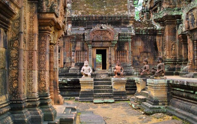 女王宮:建筑以小巧玲瓏、精致剔透、富麗堂皇而著名于世,有“東方蒙娜麗莎”之稱。由于建造此座古剎的石頭為美麗的朱紅色, 且壁畫的雕工是所有吳哥古跡中最精致細(xì)美的,另有“吳哥藝術(shù)之鉆”之美譽。