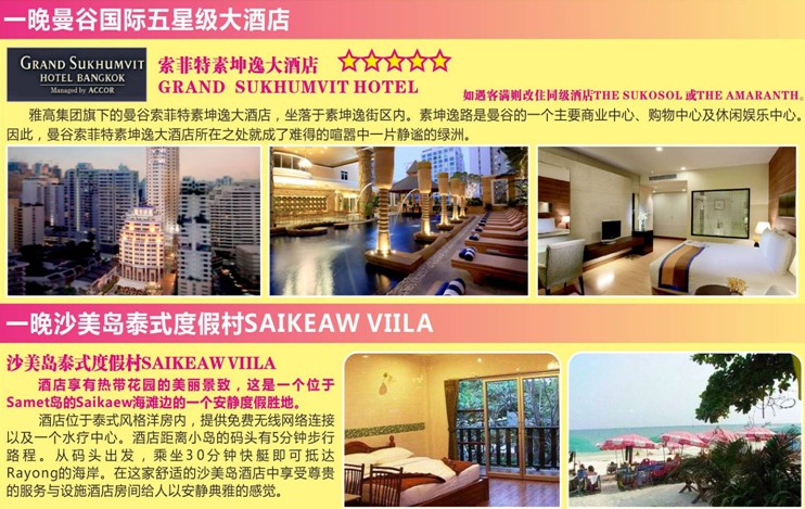 2、曼谷1晚國際5星酒店、沙美島1晚泰式度假村、曼谷2晚舒適型團隊酒店、芭堤雅1晚舒適型團隊酒店